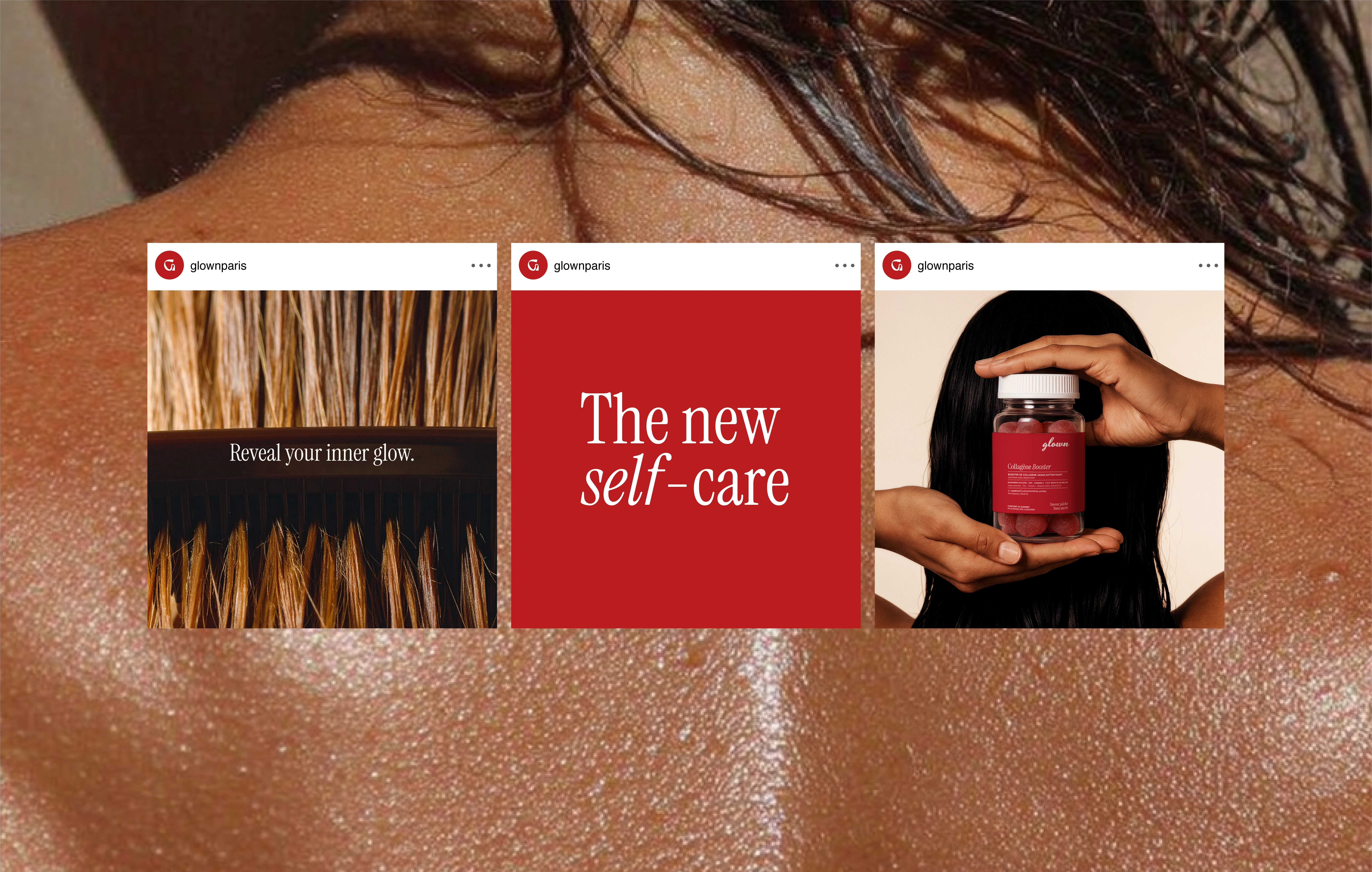 Nous avons créé une identité minimaliste et élégante qui repose sur une couleur à la fois forte et raffinée. Ce rouge que l'on peut trouver à n'importe quel coin de rue parisien, sur une porte, une terrasse de café, un sac à main ou un rouge à lèvres. Entre typographies vintage ou serif et monogramme, l'univers reprend les codes de la skincare haut de gamme pour mettre en avant ses produits et surtout ses résultats.