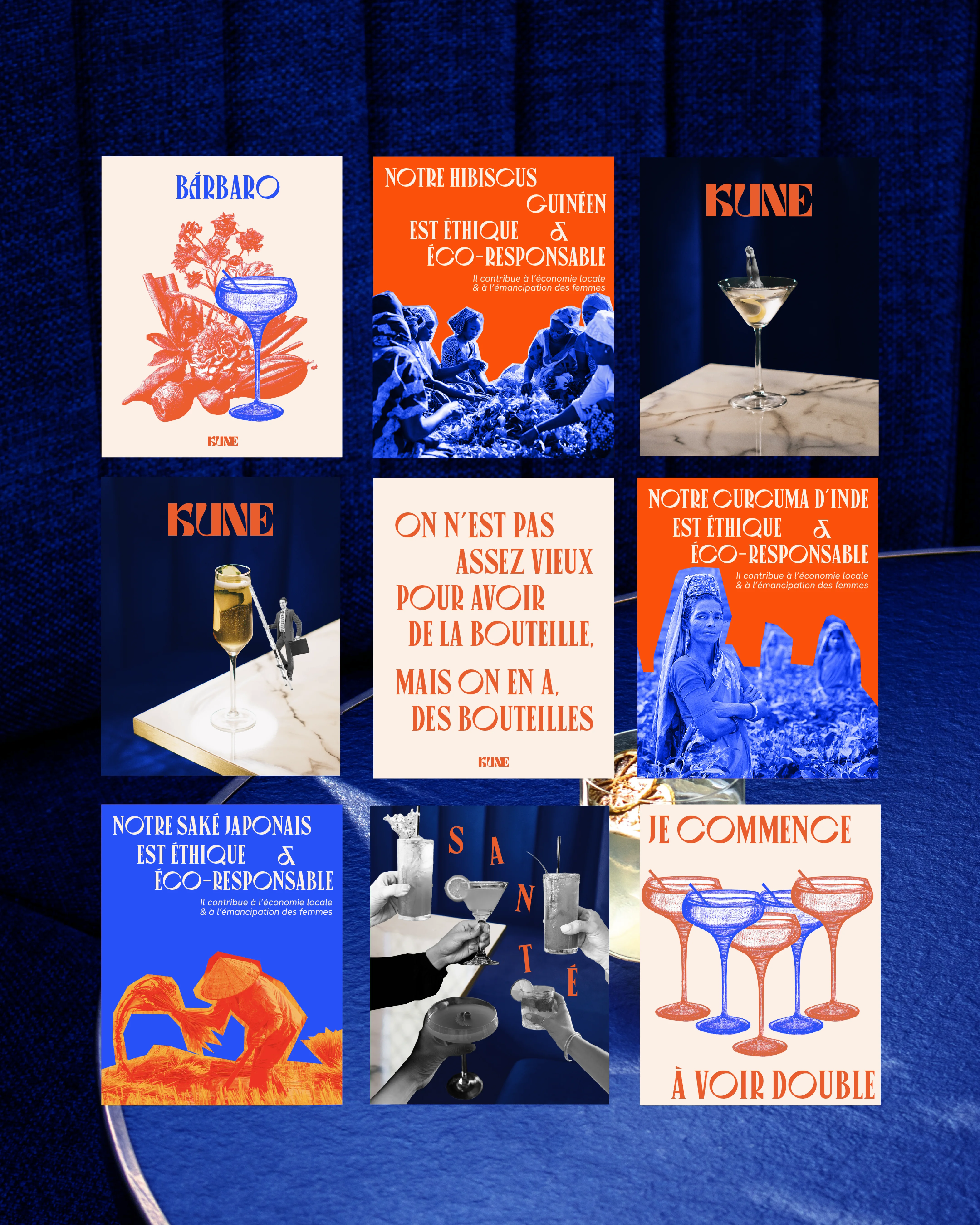 “Kune” signifie “ensemble” en Espéranto, il s’agit d’un bar à cocktail dont l’objectif est d’unir le monde malgré ses différences. Chaque boisson est élaborée autour d’un pays afin de mettre en avant ses spécificités et sa culture. Nous avons donc créé une identité colorée qui attire et dynamise le message porté par ses fondateurs.
